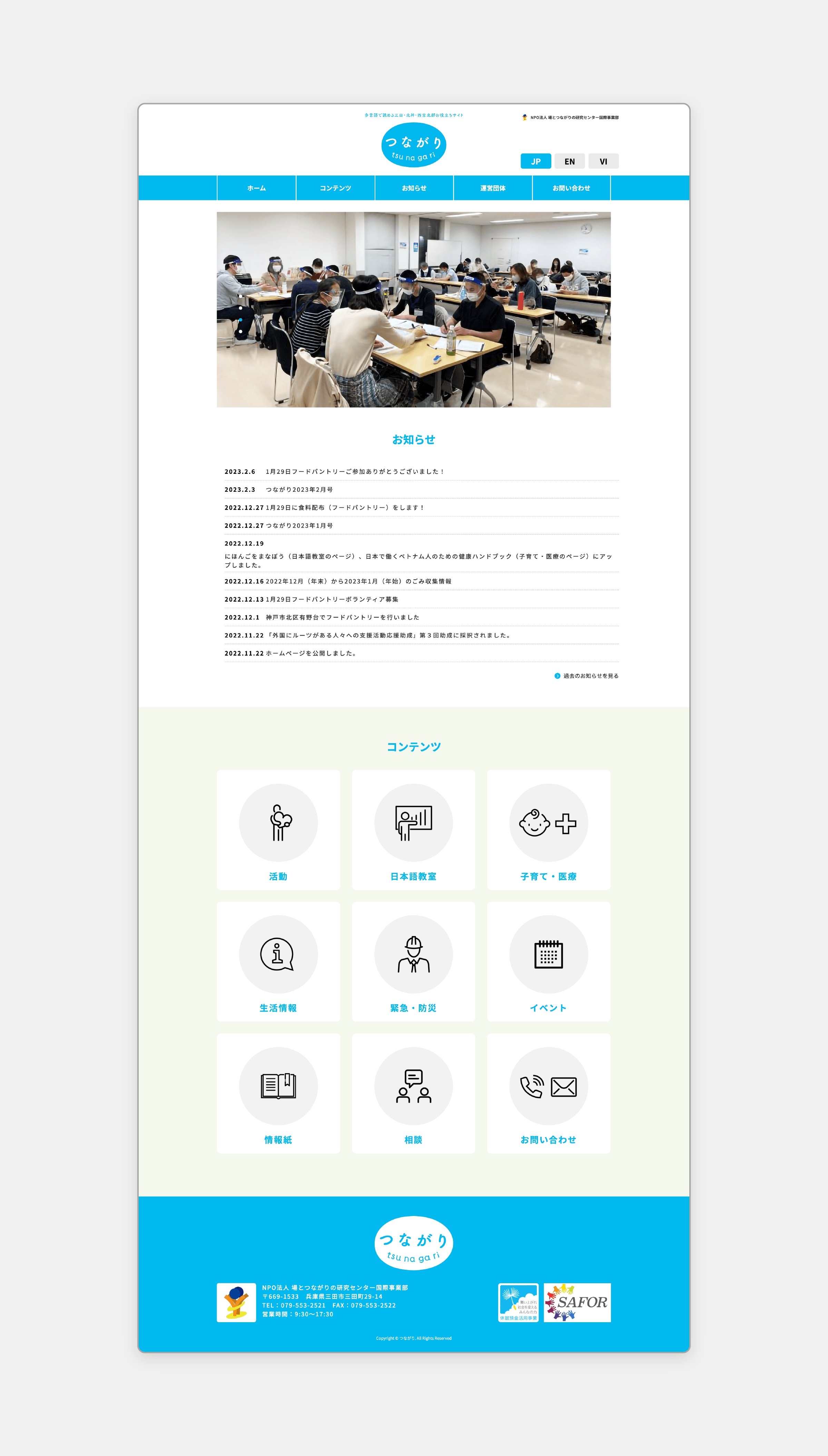 「つながり-tsunagari-」は、主に兵庫県三田市・神戸市北区北神地域・西宮市北部地域を中心としたエリアの在留外国人に役立つ情報を提供するための多言語サイトです。日本語、英語、ベトナム語の3言語で情報を掲載し、発信しています。このサイトは、兵庫県三田市で活動する団体「場とつながりの研究センター」が運営しています。